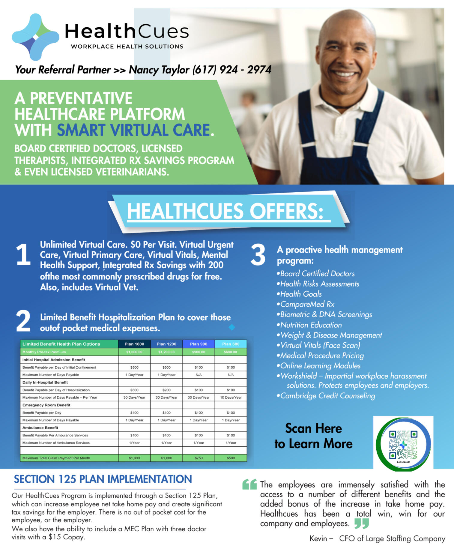 Here's what the employees get from HealthCues:- Typically a 3% - 4% increase in net take home pay- Zero out of pocket costs- Virtual urgent care, virtual primary care, virtual mental health support, virtual vet- 200 of the most commonly prescribed drugs for free- Health risks assessments- Biometric & DNA screenings and more